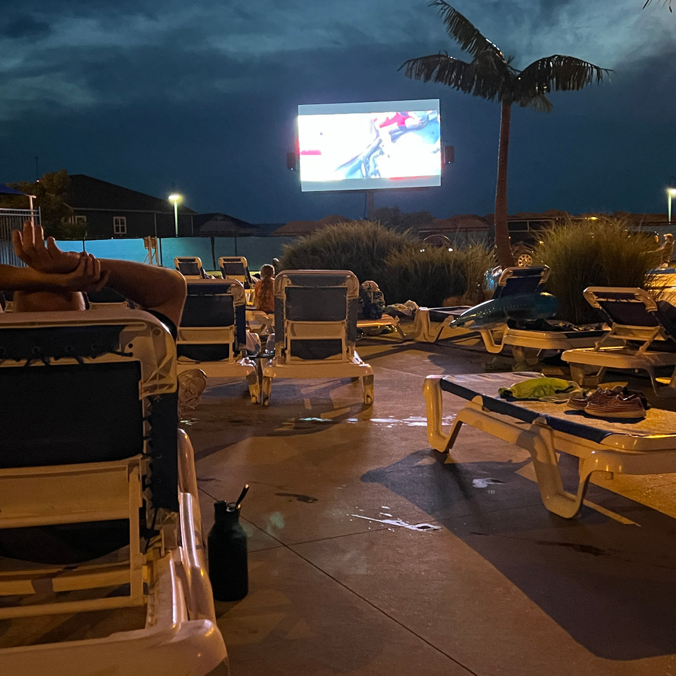 7:30 PM – Pirates of the Caribbean: Curse of the Black Pearl (Rated PG-13 – classic swashbuckling action) Both shown on a giant daylight-visible LED screen you can enjoy from the pool, patio, or your favorite floatie!